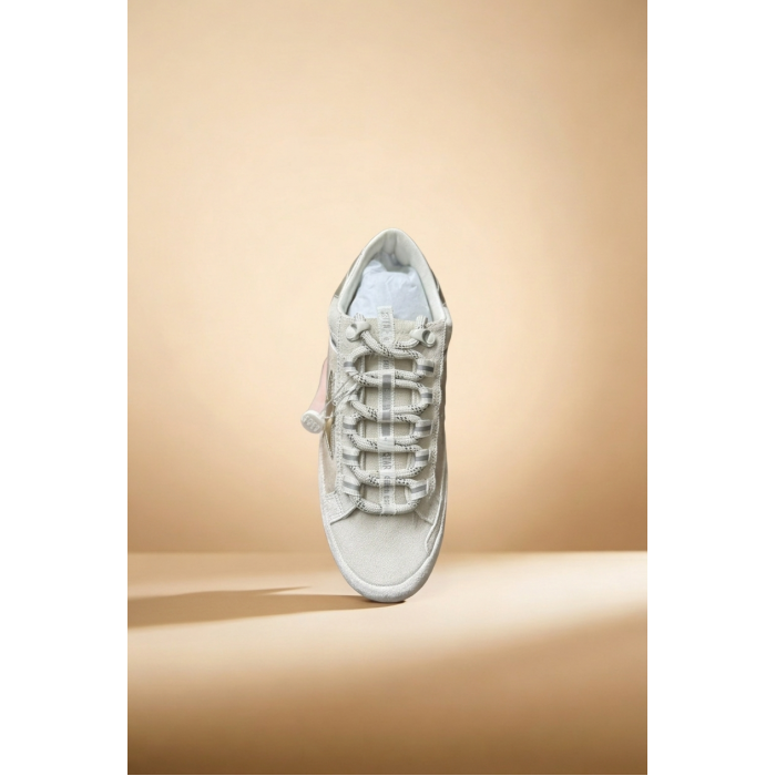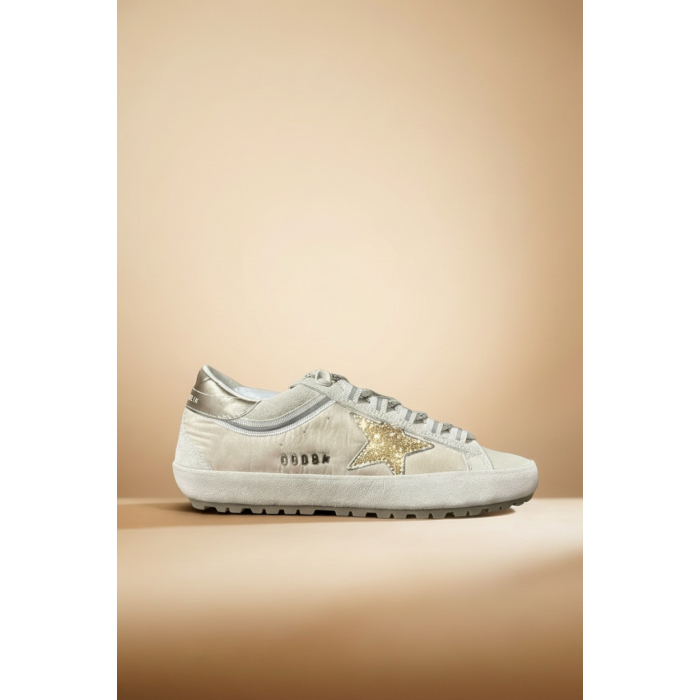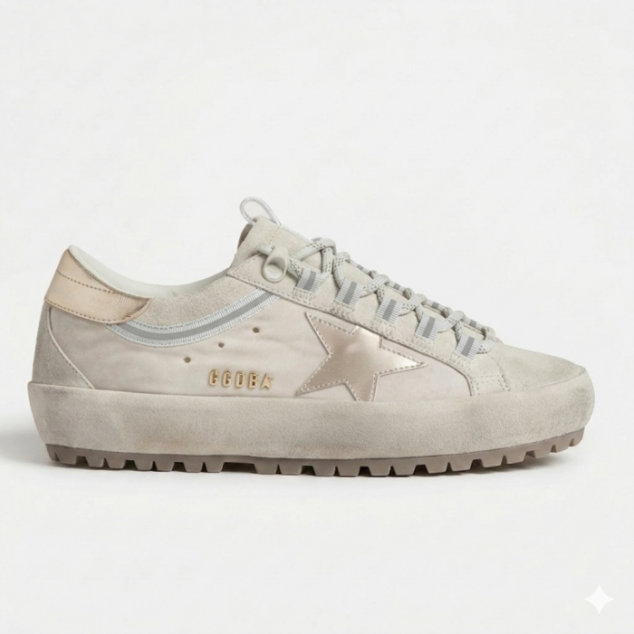 Верх кед выполнен из светло-серого нейлона, который делает обувь лёгкой, прочной и удобной для повседневной носки. Такой материал хорошо держит форму, устойчив к износу и идеально подходит для активного городского ритма. Контрастная металлическая звезда Golden Goose на боковой части создаёт выразительный акцент и подчёркивает фирменную эстетику бренда.