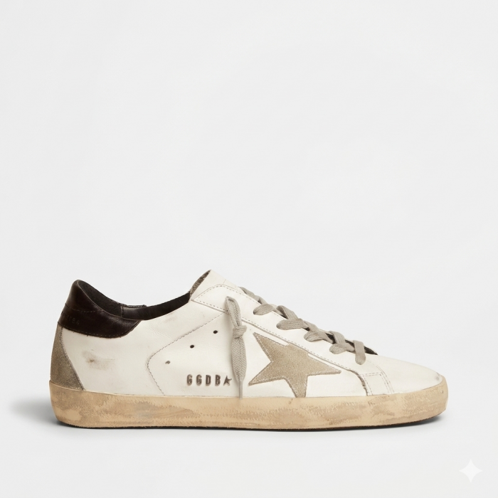 Главный элемент дизайна — фирменная звезда Golden Goose на боковой части обуви. Эта деталь является символом бренда и делает силуэт мгновенно узнаваемым. Классический белый верх гармонично контрастирует с чёрным Heel Tab — задником на пятке, который добавляет модели выразительный акцент и делает дизайн более динамичным.