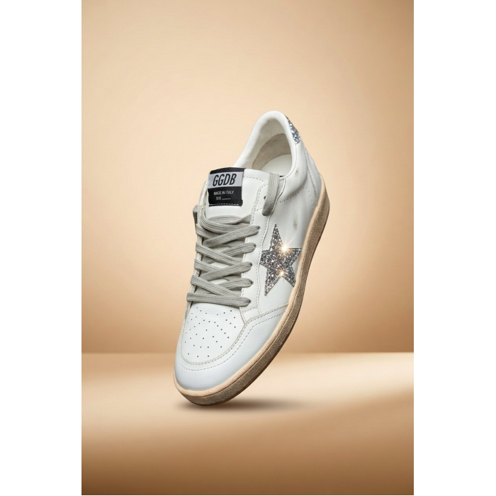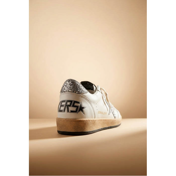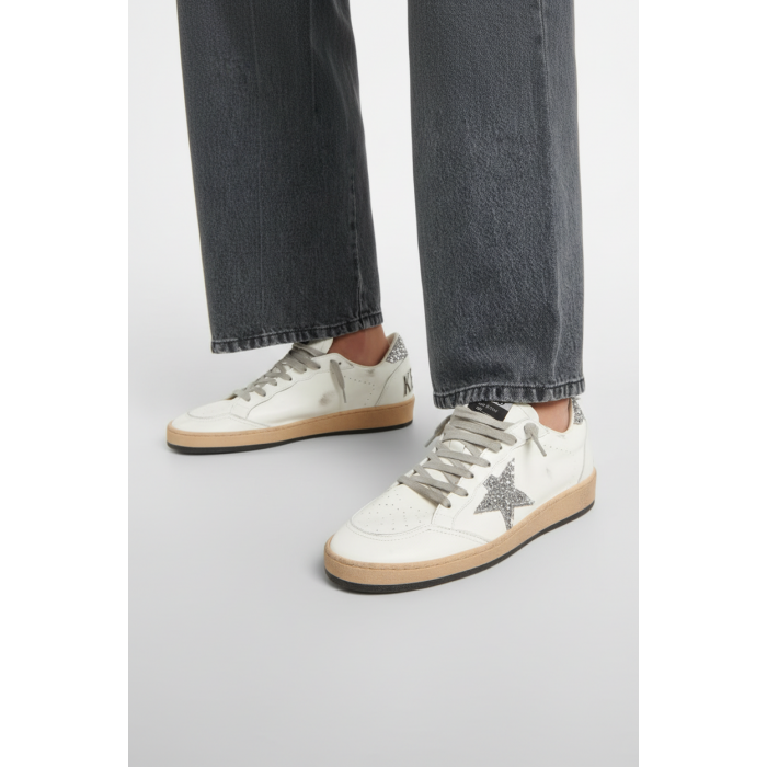 Golden Goose Ball Star Ball Star in Nappa with White Star and Glitter Heel Tab — эффектная интерпретация культовой модели Ball Star, вдохновлённой баскетбольной обувью 80-х годов. В этой версии сочетаются фирменная винтажная эстетика бренда, премиальные материалы и сияющие детали, которые делают обувь заметным элементом современного гардероба.