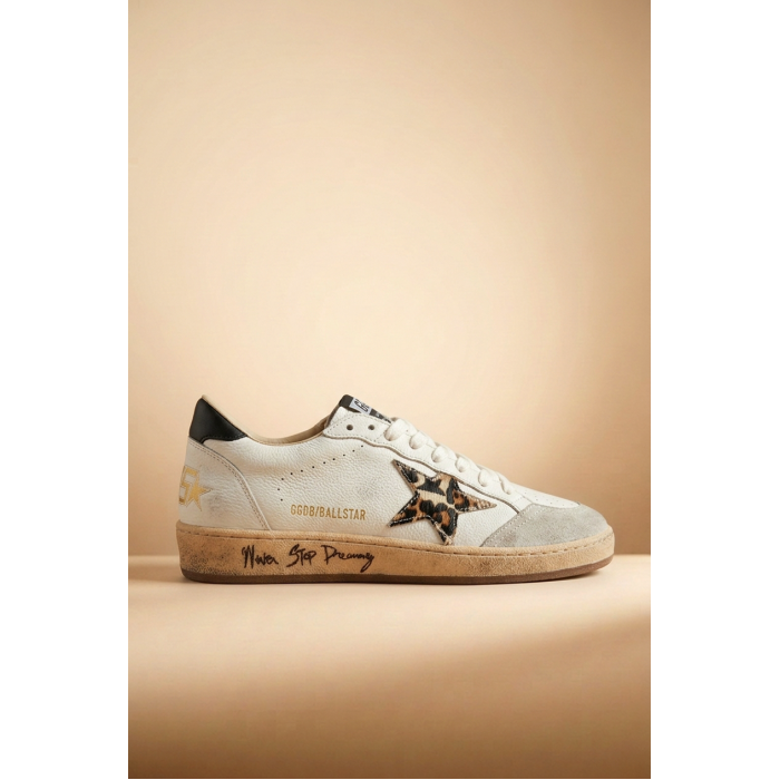 Golden Goose Ball Star Never Stop Dreaming Leopard — яркая интерпретация культовой модели Ball Star, вдохновлённой винтажной баскетбольной обувью. Эта версия выделяется выразительным leopard-принтом и фирменной философией бренда Golden Goose, отражённой в надписи Never Stop Dreaming. Модель сочетает премиальные материалы, ручную обработку и характерный стиль итальянского бренда.