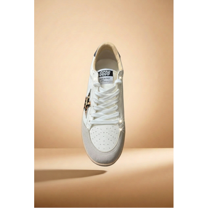 На боковой панели расположена фирменная звезда Golden Goose, которая является главным символом бренда. В сочетании с леопардовым рисунком она формирует уникальный образ модели Golden Goose Ball Star Leopard, соединяя спортивную эстетику и модный характер.