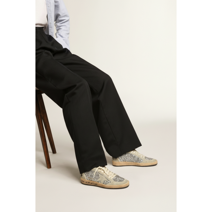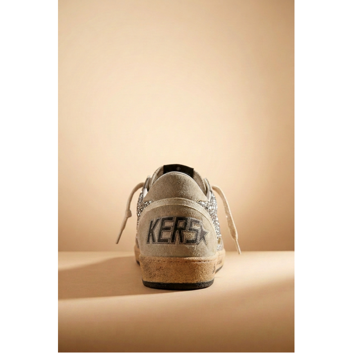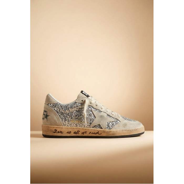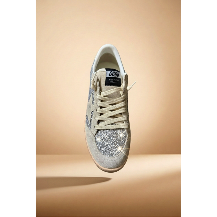 Golden Goose Ball-Star in Silver Glitter with ice-gray suede inserts — эффектная версия культовой модели Ball Star, вдохновлённой винтажной баскетбольной обувью. В этой интерпретации дизайнеры бренда объединили блестящую текстуру, мягкую замшу и фирменную ручную обработку, благодаря которой каждая пара выглядит уникально.