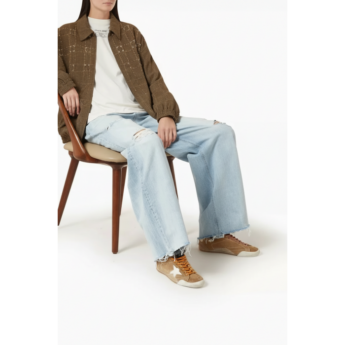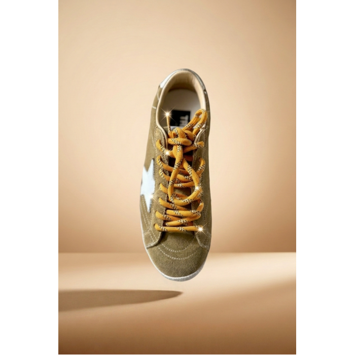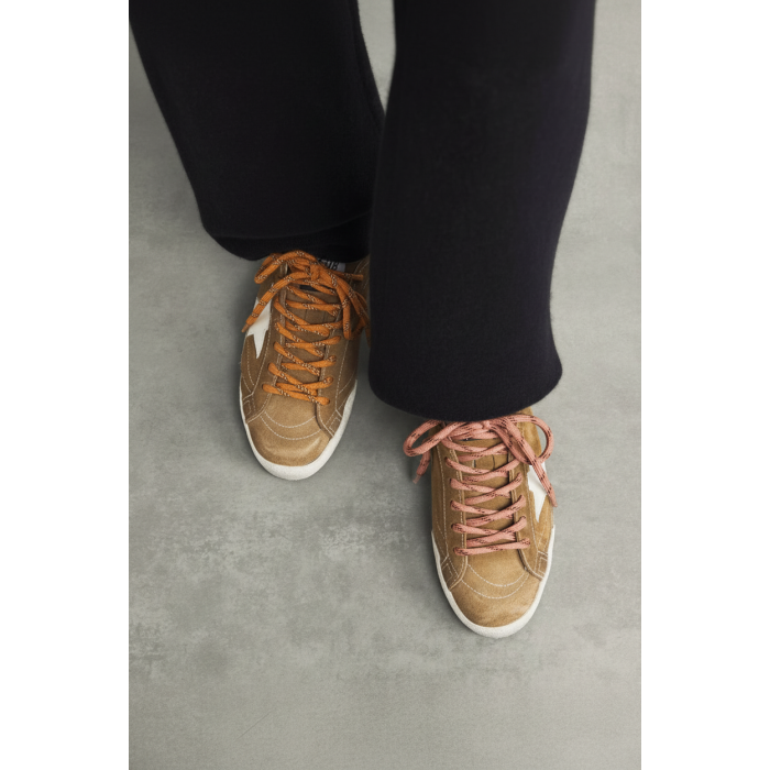 На боковой панели расположена White Star — фирменная белая звезда бренда. Контраст между светлой деталью и тёплым оттенком замши формирует узнаваемый силуэт Golden Goose True-Star Tobacco, который сразу выделяется среди других дизайнерских кед.