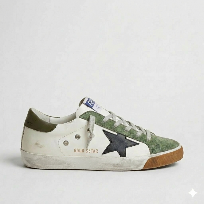 Golden Goose Super Star White With Green Suede Toe And Black Star